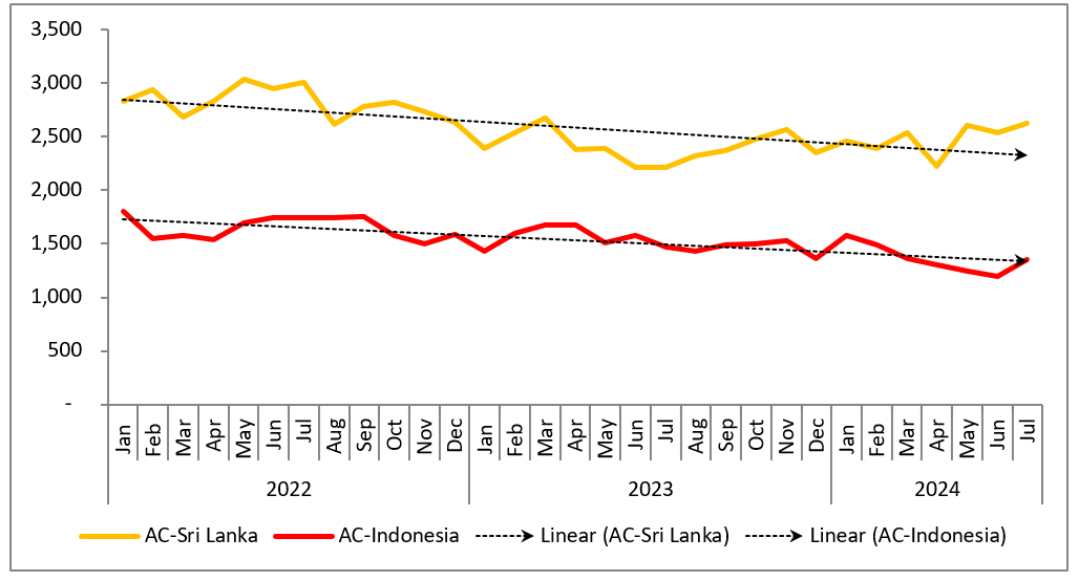 Hình 6. Giá Xuất Khẩu Than Hoạt Tính US$/MT tại Sri Lanka và Indonesia từ tháng 1 năm 2022 – tháng 7 năm 2024