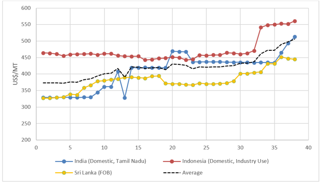 Hình 5. Giá Than Vỏ Dừa Hàng Tuần (US$/MT) tại Ấn Độ, Indonesia và Sri Lanka, Tuần 1-38 của năm 2024