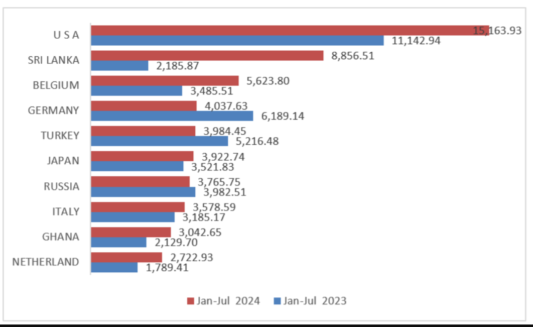 Hình 1. Top 10 Điểm Đến Xuất Khẩu Than Hoạt Tính từ Ấn Độ (MT), Tháng 1-Tháng 7 năm 2023 và 2024